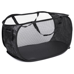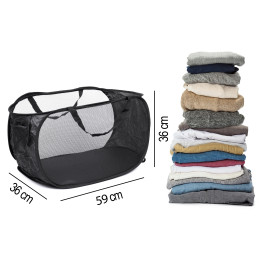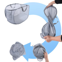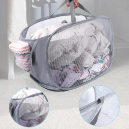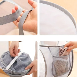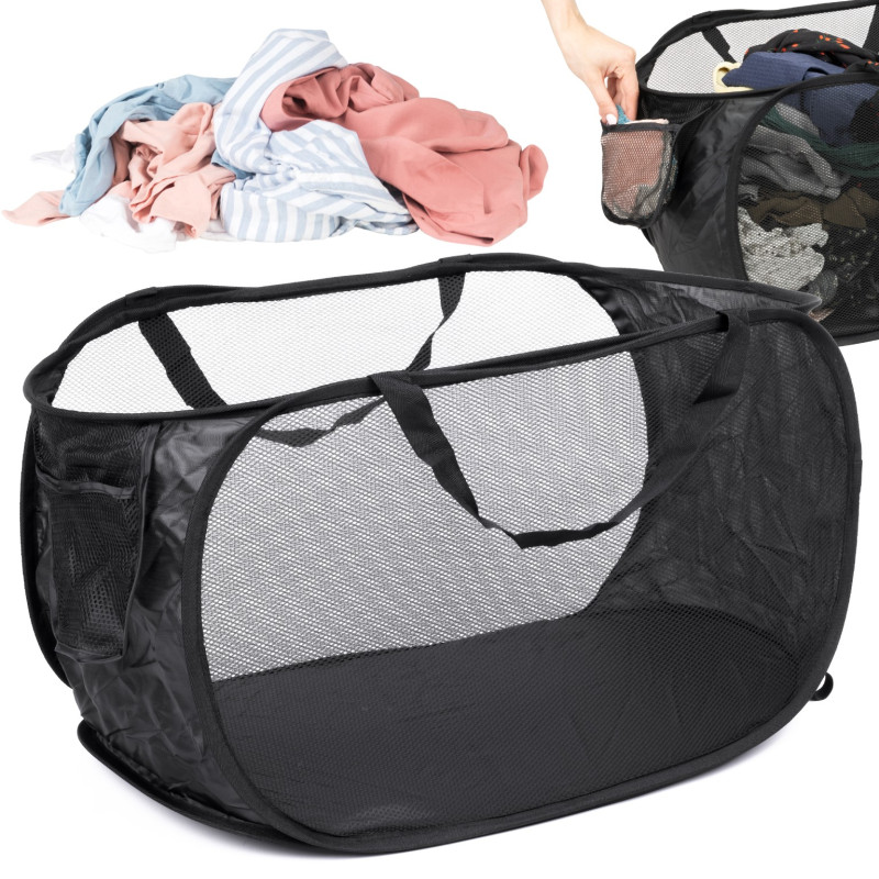 Wykonany z trwałego, przewiewnego materiału siatkowego, zapewnia odpowiednią cyrkulację powietrza, co zapobiega gromadzeniu się wilgoci i nieprzyjemnych zapachów. Dodatkowa mała boczna kieszonka to idealne miejsce na klamerki, woreczki do prania lub inne drobiazgi.