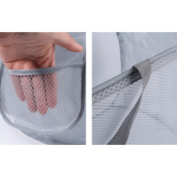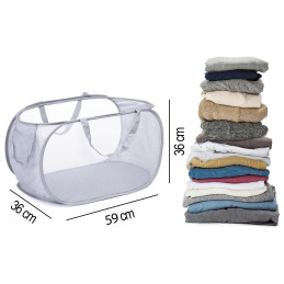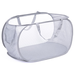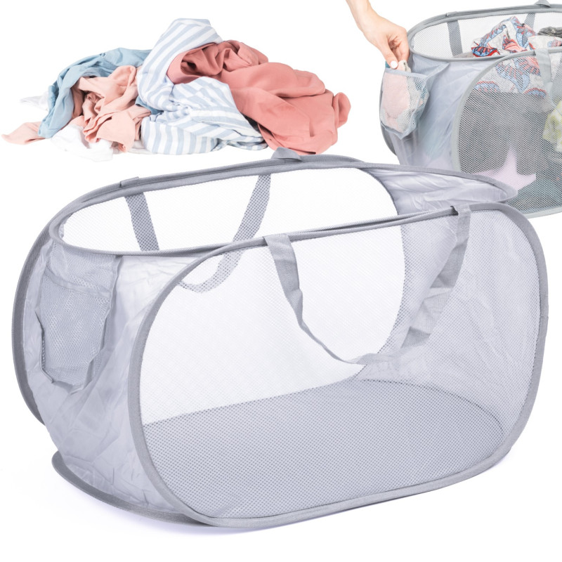 Wykonany z trwałego, przewiewnego materiału siatkowego, zapewnia odpowiednią cyrkulację powietrza, co zapobiega gromadzeniu się wilgoci i nieprzyjemnych zapachów. Dodatkowa mała boczna kieszonka to idealne miejsce na klamerki, woreczki do prania lub inne drobiazgi.