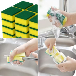Uniwersalne gąbki kuchenne o wymiarach 9 x 6 x 3 cm to niezbędny element wyposażenia każdej kuchni. Sprawdzą się zarówno w codziennym myciu naczyń, jak i w usuwaniu trudniejszych zabrudzeń z garnków, patelni, blatów kuchennych czy zlewu. Dzięki klasycznej budowie i optymalnym wymiarom gąbki są wygodne w użyciu i dobrze leżą w dłoni.